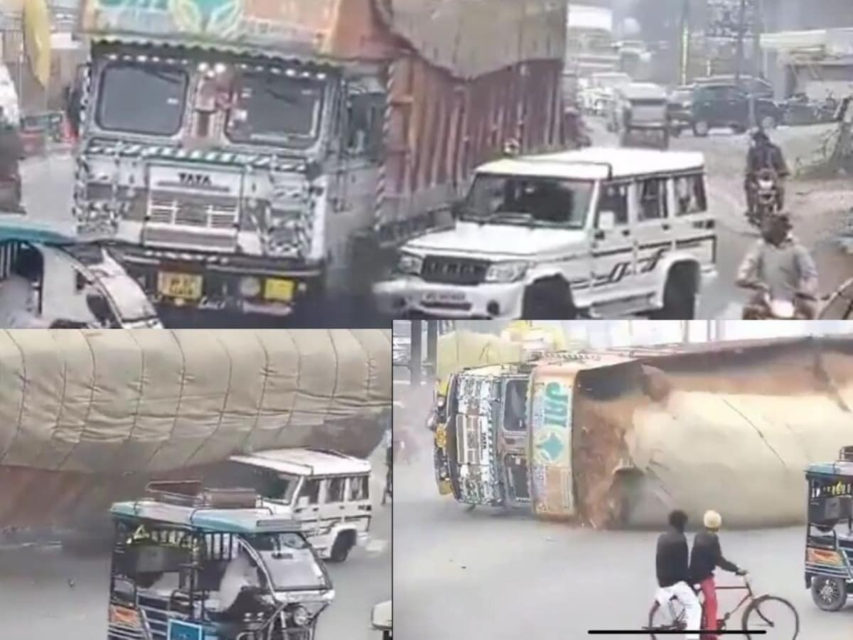 सड़क पर साक्षात मौत बोलेरो पर जा पलटा भूसे से लदा भारी ट्रक, वीडियो देखकर थम जाएंगी धड़कनें