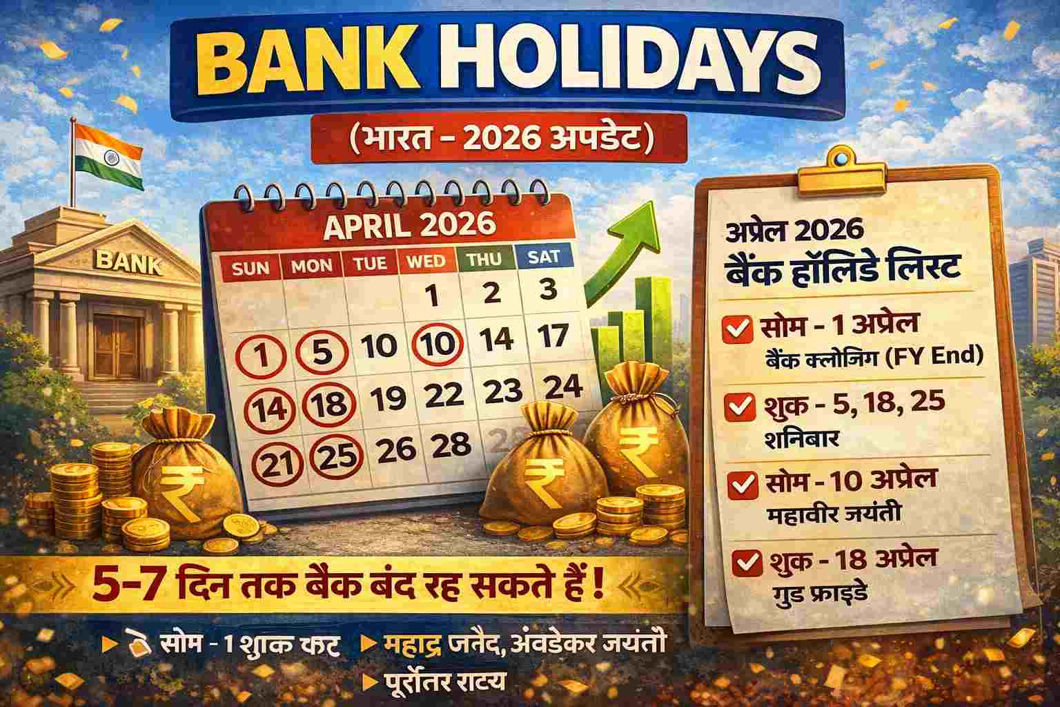 नई दिल्ली: आज शुक्रवार, 3 अप्रैल 2026 को देशभर में ‘गुड फ्राइडे’ का पर्व मनाया जा रहा है। ईसा मसीह के बलिदान की याद में मनाए जाने वाले इस दिन के अवसर पर देश के अधिकांश हिस्सों में सार्वजनिक अवकाश है। यदि आप आज बैंक संबंधी किसी जरूरी काम के लिए घर से निकलने वाले हैं, तो यह खबर आपके लिए बेहद महत्वपूर्ण है। भारतीय रिजर्व बैंक (RBI) की आधिकारिक सूची के अनुसार, आज कई राज्यों में बैंक शाखाएं बंद रहेंगी, जबकि कुछ चुनिंदा राज्यों में कामकाज सामान्य रूप से जारी रहेगा।आज इन राज्यों में रहेगी बैंक की छुट्टीगुड फ्राइडे के चलते आज देश के अधिकांश बड़े राज्यों और केंद्रों में बैंक बंद रहेंगे। इनमें प्रमुख रूप से शामिल हैं:उत्तर और मध्य भारत: दिल्ली, उत्तर प्रदेश, मध्य प्रदेश, उत्तराखंड, छत्तीसगढ़ और हिमाचल प्रदेश।पश्चिम और दक्षिण भारत: महाराष्ट्र (मुंबई/नागपुर), गुजरात, केरल, तमिलनाडु, कर्नाटक, आंध्र प्रदेश, तेलंगाना और गोवा।पूर्वी भारत: पश्चिम बंगाल, बिहार, ओडिशा और झारखंड।पूर्वोत्तर: मिजोरम (आईजॉल), नगालैंड (कोहिमा), सिक्किम (गंगटोक) और मणिपुर (इंफाल)।यहाँ आज खुले रहेंगे बैंक (नो हॉलिडे जोन)हैरानी की बात यह है कि गुड फ्राइडे के बावजूद देश के कुछ राज्यों में आज बैंक खुले रहेंगे। RBI की लिस्ट के मुताबिक निम्नलिखित क्षेत्रों में आज छुट्टी नहीं है:राजस्थान (जयपुर)जम्मू-कश्मीर (जम्मू और श्रीनगर)चंडीगढ़त्रिपुरा (अगरतला)असम (गुवाहाटी)अप्रैल 2026 में छुट्टियों की भरमार: आने वाले मुख्य अवकाशअप्रैल का महीना बैंक की छुट्टियों से भरा हुआ है। आने वाले दिनों में इन तारीखों पर भी बैंक बंद रहेंगे:14 अप्रैल: डॉ. अंबेडकर जयंती, बैसाखी, तमिल नववर्ष और बिहू के उपलक्ष्य में देशभर के अधिकांश राज्यों में बैंक बंद रहेंगे।15 अप्रैल: हिमाचल दिवस, बंगाली नववर्ष और विशु के कारण हिमाचल प्रदेश, पश्चिम बंगाल और केरल जैसे राज्यों में छुट्टी रहेगी।20 अप्रैल: अक्षय तृतीया और बसव जयंती के कारण कर्नाटक और कुछ अन्य क्षेत्रों में बैंक बंद रहेंगे।21 अप्रैल: गरिया पूजा के अवसर पर त्रिपुरा में बैंक अवकाश रहेगा।डिजिटल सेवाएं रहेंगी चालूभले ही आज आपके शहर में बैंक की शाखाएं बंद हों, लेकिन आपको बैंकिंग ट्रांजेक्शन के लिए परेशान होने की जरूरत नहीं है। बैंक बंद होने की स्थिति में भी निम्नलिखित डिजिटल सेवाएं 24×7 उपलब्ध रहेंगी:UPI (Google Pay, PhonePe, Paytm)नेट बैंकिंग और मोबाइल बैंकिंगATM सेवा (कैश निकासी के लिए)IMPS/NEFT/RTGS (ऑनलाइन फंड ट्रांसफर)नोट: चेक क्लियरिंग, डिमांड ड्राफ्ट (DD) बनवाने और फिजिकल केवाईसी जैसे कामों के लिए आपको अगले कार्यदिवस का इंतजार करना होगा।